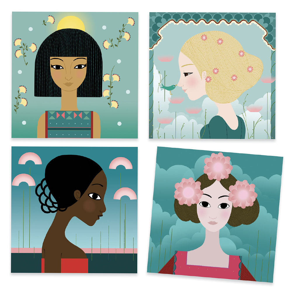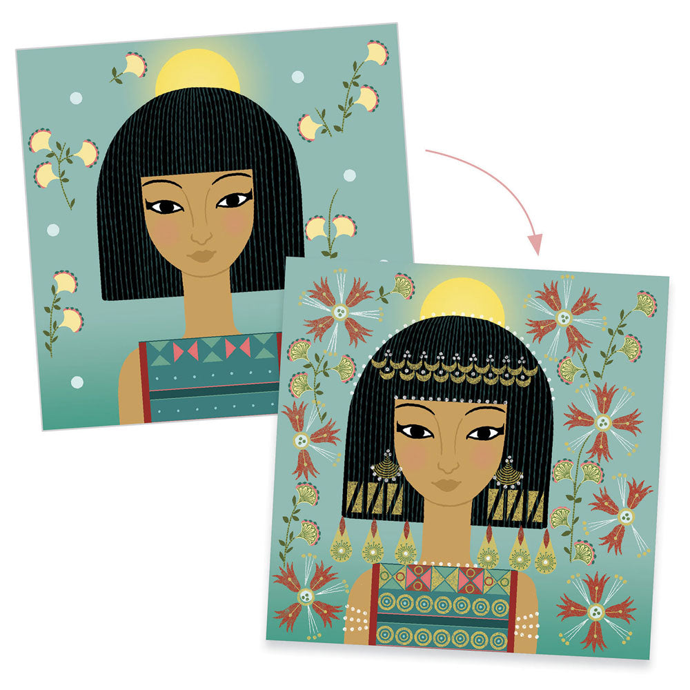 Ett kul pyssel med stämplar där du ska skapa mönster att dekorera de fina bilderna på prinsessor från hela världen med. Eftersom stämplarna är genomskinliga kan man lätt se vart man är på bilden och placera stämpeln rätt i förhållande till mönstret. Allt eftersom aktiviteten fortskrider pryds tjejernas hår och kläder med eleganta grafiska utsmyckningar och bilderna får nytt liv. Dom genomskinliga stämplarna sätts fast på ett tjockt genomskinligt block så att du lättare kan lämna ett tydligt avtryck som inte hamnar fel eller kladdar, och den svampiga rengöringsmattan gör det lätt att rengöra stämplarna. Bläcket i stämpeldynorna kan lätt kan tvättas av om det hamnar på händer, kläder eller någon annan stans där det inte ska vara.