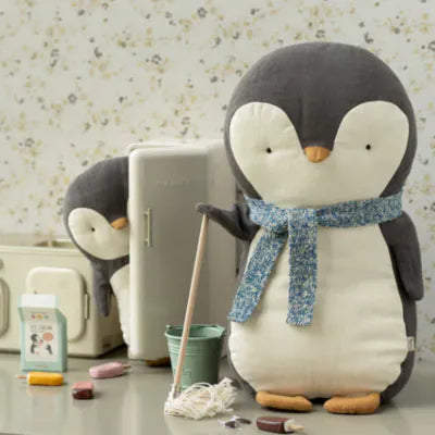 En kär liten vän, en söt pingvin i storlek medium med scarfs från Maileg. Ett underbart litet gosedjur som gör varje unge glad. En rolig karaktär som är gjord i finaste tyg och med pärlor som ger tyngd i baken så att den lätt kan sitta själv. Så go med sina varma scarfs för kalla vinterdagar.