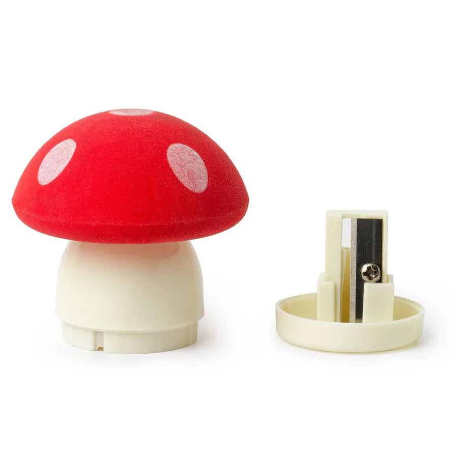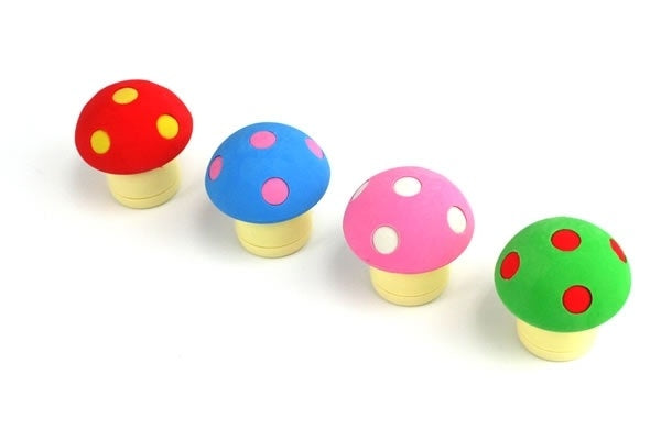 Ett sett med sudd och pennvässare i form att söta svampar i olika färger.