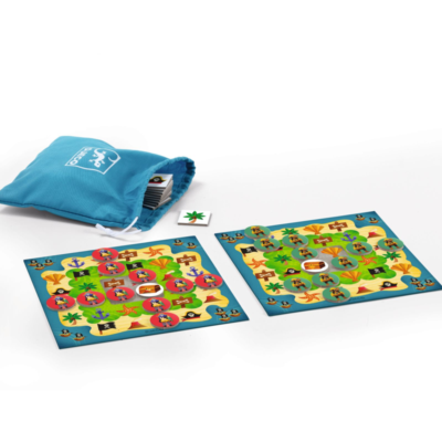 Innehåll: 4 spelbräden av kraftig kartong, 4 polletter med en skattkista, 40 pirat-polletter (4 uppsättningar av 10), 1 bomullspåse, 35 plats-brickor, spelregler på tio språk inklusive svenska, 1 förvaringsask.