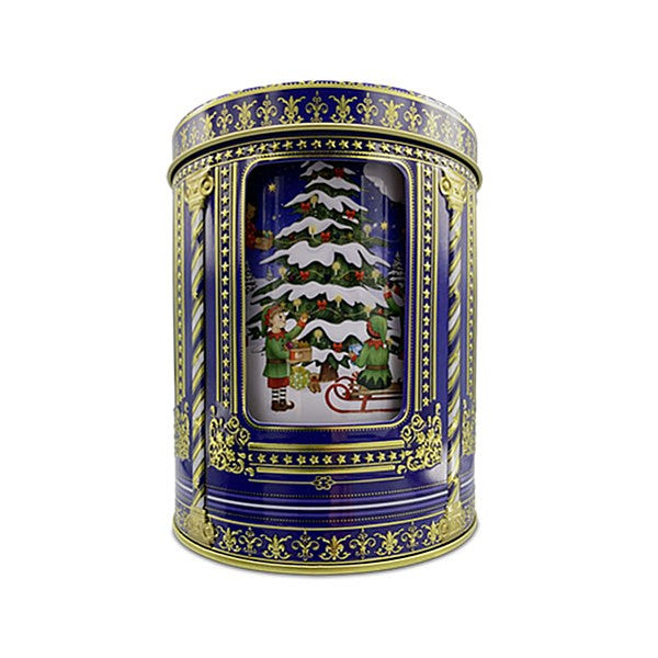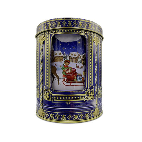Plåtburk Speldosa Ängel. Plåtburk som ser ut som en karusell med speldosa. Spelar melodin ”Hark the Herald Angels Sing” av Felix Mendelssohn. Skruva upp speldosan under burken så snurrar bakgrundsbilden med motivet av änglar och tomtenissar runt. Perfekt till julgodiset! Rymmer 750 ml.