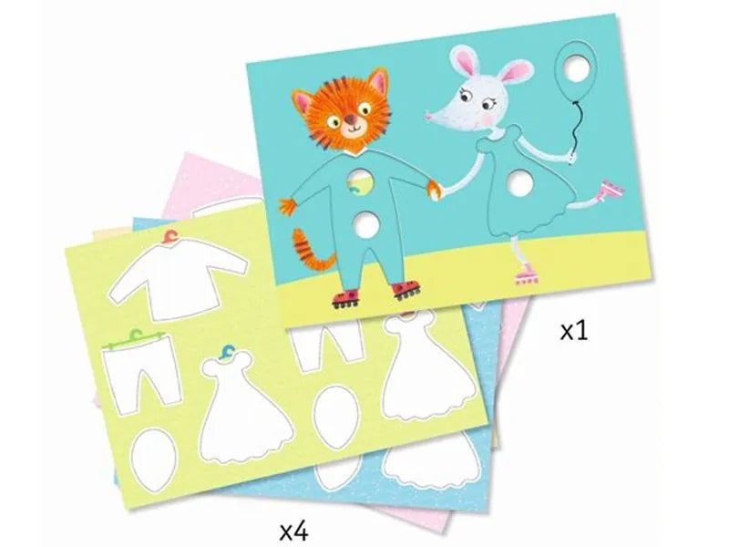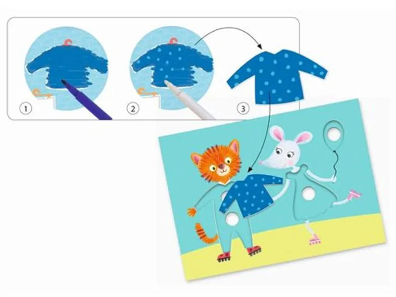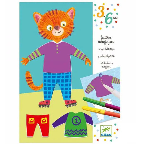 Djeco Magiska tuschpennor: Elliots och Zoes kläder. Ett klassiskt klädleks-spel med en rolig twist: barnen färglägger kläderna och ritar sedan över dem med den vita tuschpennan – och vips, färgerna ändras och mönster dyker upp! Superkul för barn från 3 år och uppåt.