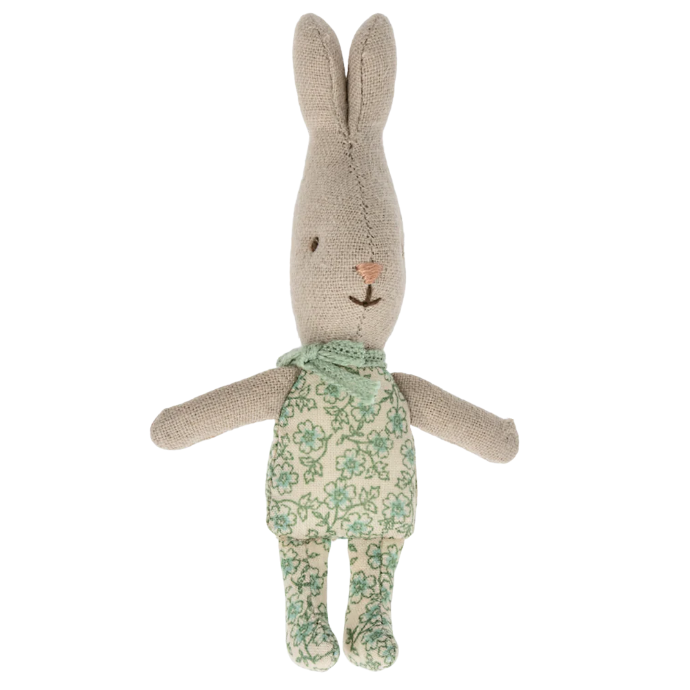 Söt beige mini kanin med gröna blommor på kläderna och en fin rosett runt halsen.