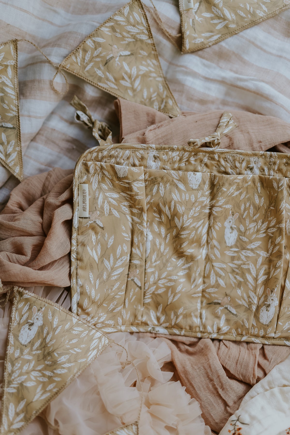 Vår stilrena sängficka med två rymliga fack gör det enkelt att hålla ordning på småsaker – perfekt vid skötbordet, spjälsängen eller hängande på en kroklist. Den är både funktionell och en vacker detalj i barnrummet.