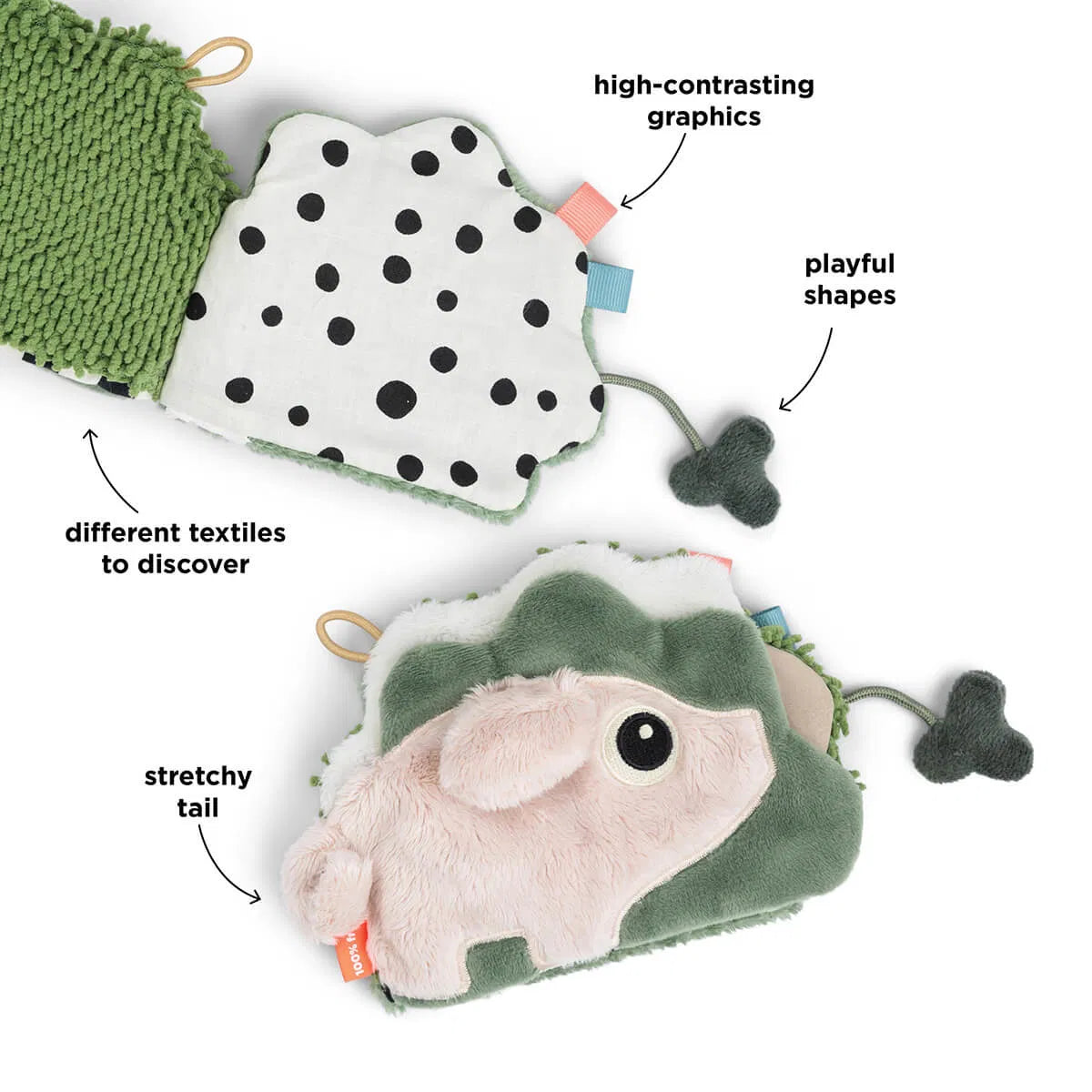 Den elastiska öglan gör det enkelt att fästa boken på ett babygym eller andra leksaker. Med lekfulla kontraster och färgglada detaljer blir det en rolig och stimulerande upplevelse. Låt Deer friends underhålla din lilla under lektiden!