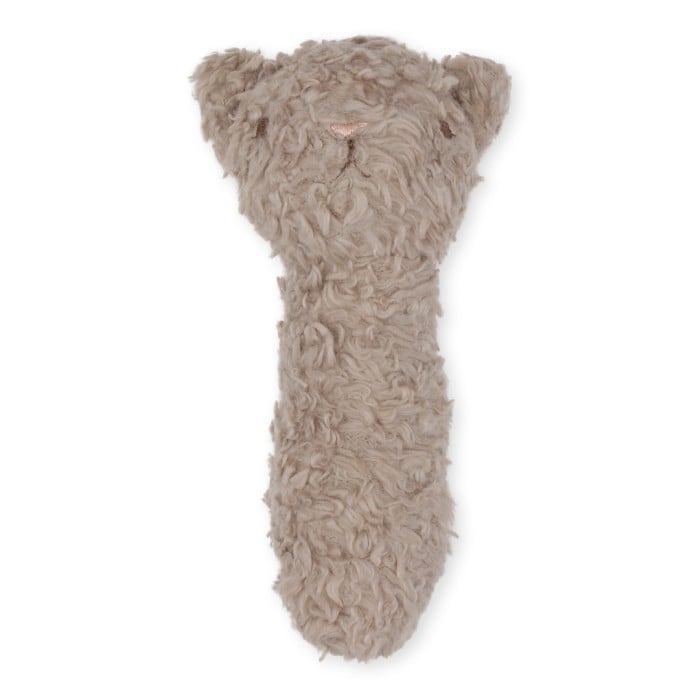 Mjuk skallra med strukturerade ytor i ekologisk bomull. Ger ett ljud när det skakas. Designad i en form som är lätt för spädbarn att greppa och utveckla sina finmotoriska färdigheter genom att lära sig att hålla skallran i ena handen och sedan överföra leksaken till en annan hand.