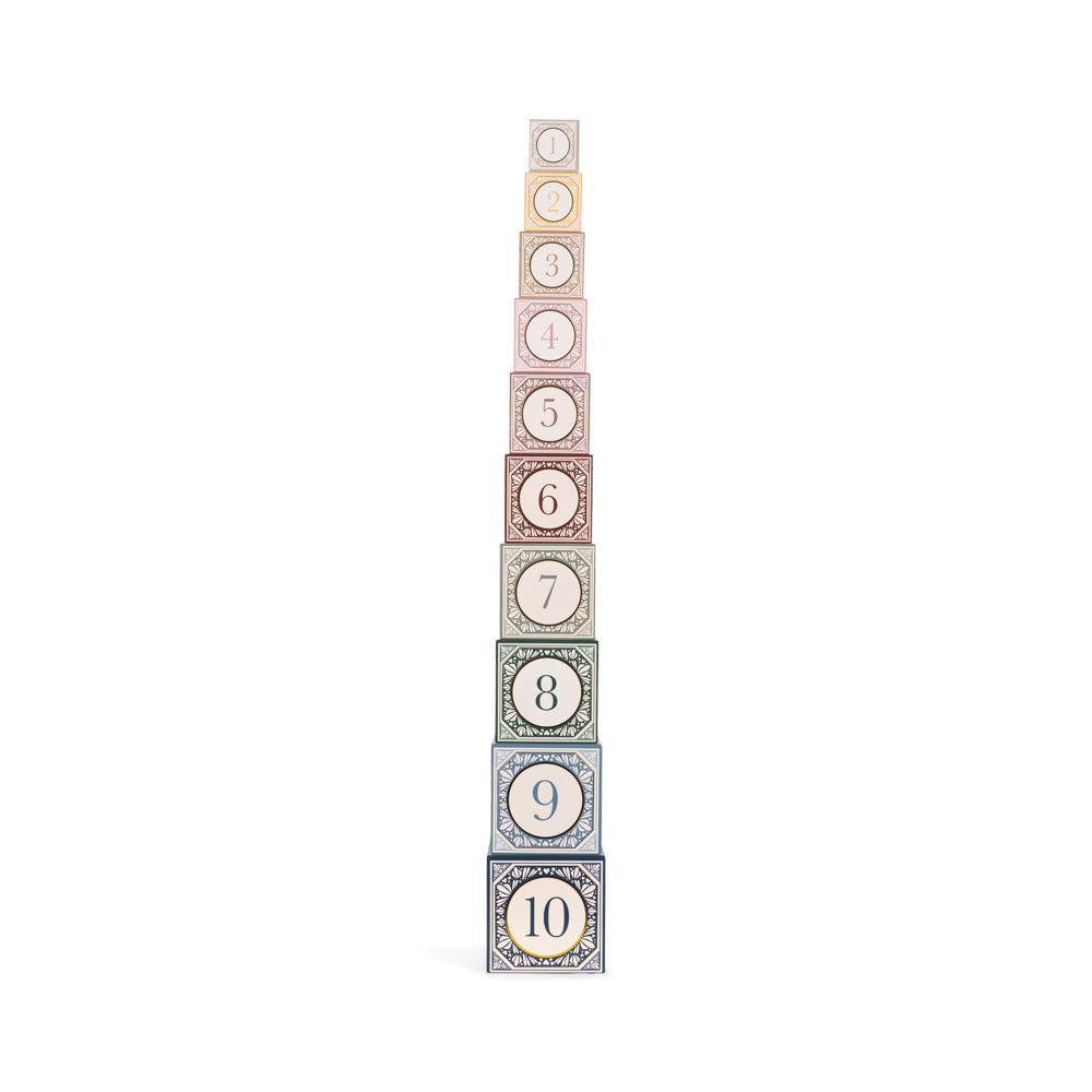 Stapelklossar i kartong ifrån Konges Slöjd, med siffror från 1-10. Innehåller 10 klossar att bygga med.