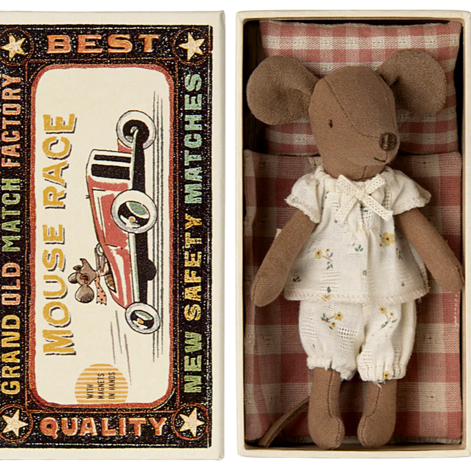 Säg god natt till en av Mailegs mest älskade figurer – Storasyster Mus i tändsticksask, klädd i ett vackert blommigt nattlinne. Denna charmiga lilla mus kommer i sin egen klassiska Maileg tändsticksask, komplett med madrass, kudde och täcke – allt i mjuka tyger och vackra mönster.