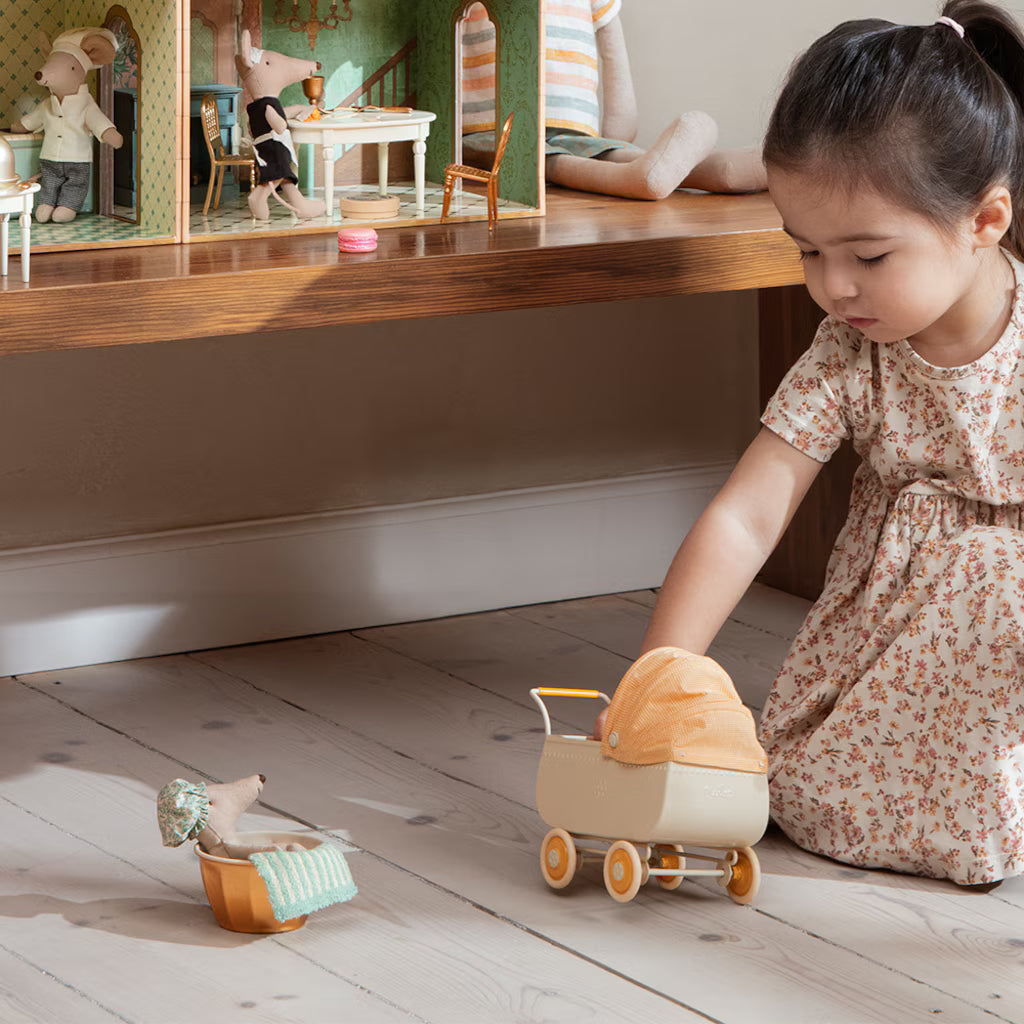 Den här söta leksaken älskar att koppla av i varmt vatten och spendera timmar i sin gyllene badbalja. Setet innehåller en liten mus iklädd badmössa, handduk och badkar – perfekt för fantasifull lek.