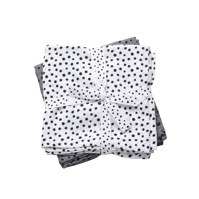 Ett set med två mjuka och sköna muslinfiltar i happy dots gråfärg. Låt prickarna underhålla ert barn under barnvagnspromenaden eller i barnsängen. Kan också användas som trasa mot axeln för att skydda dina kläder under amning. Mjuk och sval filt med bra uppsugningsförmåga.