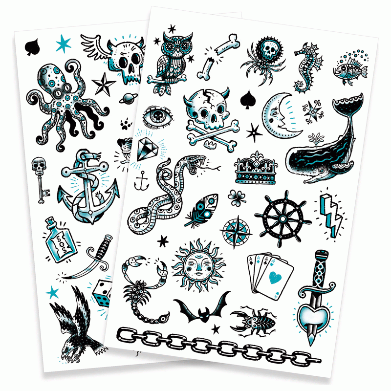 Förpackningen innehåller två ark med 50+ tatueringar.