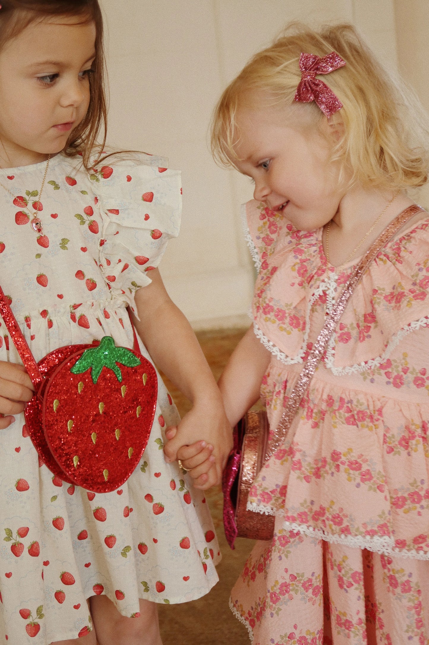 Jordgubbs-formad axelväska. Designad med glitter och ett smalt axelband.