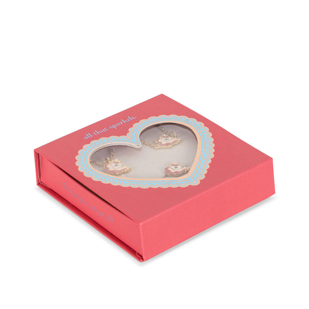 Ett magiskt smyckesset från Konges Slöjd. Perfekt för kalaset, maskeraden eller för den som vill ha lite extra glitter i vardagen! Varje smycke är dekorerad med en rosa, glimrande enhörning som förvandlar varje tillfälle till en saga.