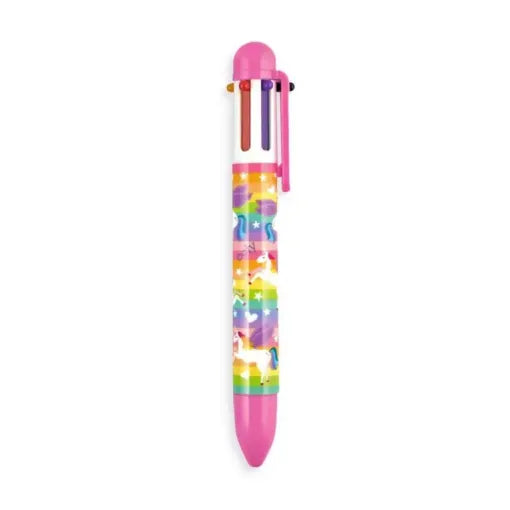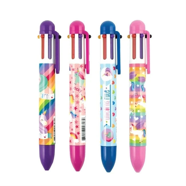 Rolig klickpenna med unicorn 6 olika färger i samma penna, lila, röd, orange, grön, blå och svart.