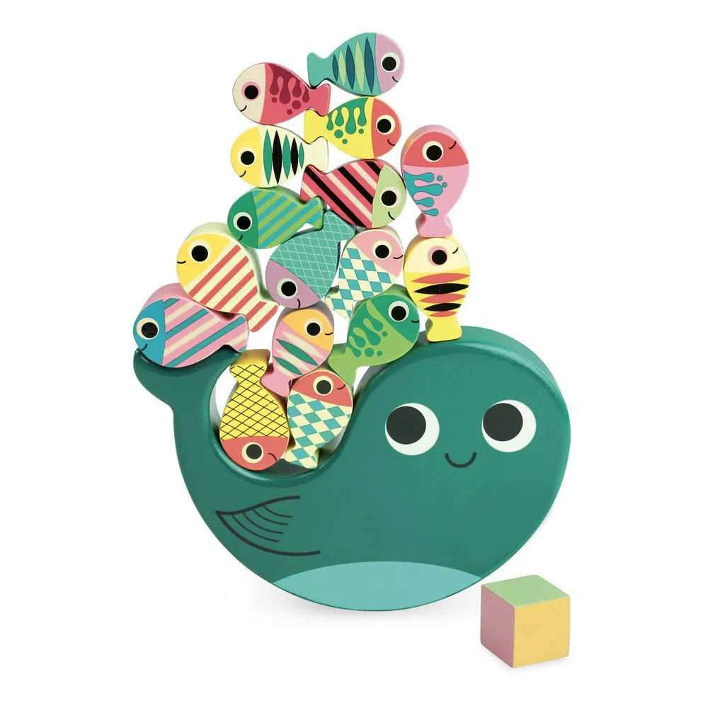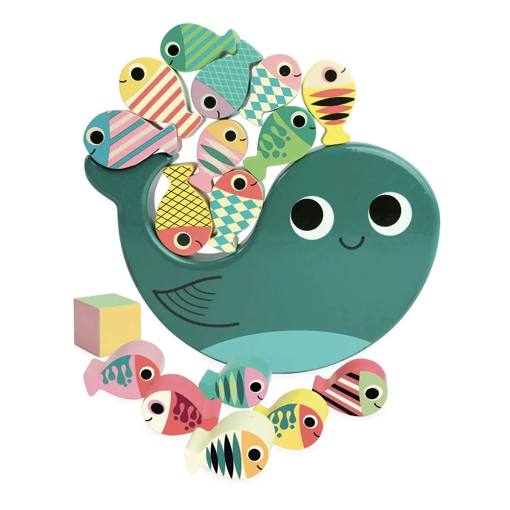 Slå tärningen och försök att stapla de sexton fiskarna på Whaly, trävalen, i den angivna färgen. Var försiktig så att du inte tappar allt!