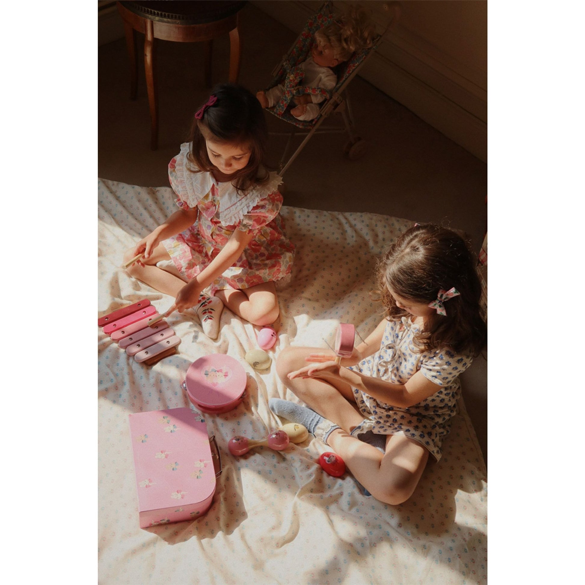 Detta fina musikinstrumentset är perfekt för små musiker som vill utforska ljud och rytmer. Setet innehåller maracas, en xylofon, handtrumma och tamburin – allt snyggt förpackat i en dekorativ tygpåse med dragsko och en charmig pappresväska.